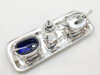 A 3 piece EPNS cruet set complete with glass liners, original spoons and tray. In a nice quality case with presentation plaque to a Captain R.N. Dickson dated 1981. All gleaming silver, a small patch of darker tarnish to the mustard pot ornate rim. Some salt related wear to the interior of the salt pot but hidden by the glass liner. Spoons fine, slight marks to tray from use. Case has some slight scuffs. GBP39.99