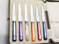 An unusual set of 6 fruit dessert knives by Wm Hutton & Sons of Sheffield c. 1930, having different colour stains to the mother of pearl (other than one that is natural). All good with some surface marks from use. Case has some scuffs/slight loss of covering to one corner. GBP59.99