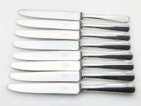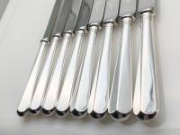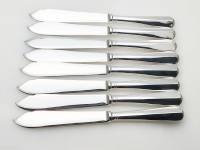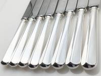 A good vintage set of 8 dinner knives in Hanoverian by Mappin & Webb, with silver plated handles and steel blades. All hand polished & gleaming silver with some use marks. 2 blades have some slight shadow type marks to the steel. GBP31.99