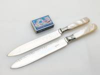 Here are 2 longer length cake knives with mother of pearl handles and silver plated blades. Handles both good, one has a small natural pit to rear of handle. One has some plate wear at tip of blade and hilt areas and also at the EPNS makers mark, the other has some spots of wear to front and back of blade. They still look reasonable enough. GBP19.99