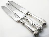 Here are 3 large bread knives with steel blades, one has a sterling silver handle fully hallmarked for Sheffield 1900, the other 2 have silver plated handles. Obvious surface rust marks to blades. The sterling silver handled one has some general handle knocks and its blade set not quite straight to handle, as has the other pistol grip example. Both of the plated handled ones have some slight plate wear. GBP44.99